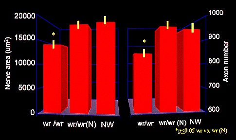 B: Plot of the total cross-sectional area of the medial facial nerve for each group. Values represent the mean +S.E.M, (*) signifies a significant difference (p<0.05) compared to wr/wr group. Control treated wr/wr mice, n=17; NAC treated wr/wr mice, n=11; NW mice, n=11; NW(N) mice, n=10. p values: wr/wr vs. wr/wr(N) <0.004, wr/wr vs. NW < 0.005; wr/wr vs. NW(N) < 0.006. Second Plot: Number of axons in nerve cross-sections. For all groups n=10. p values: wr/wr vs. wr/wr(N) <0.027, wr/wr vs. NW <0.030.