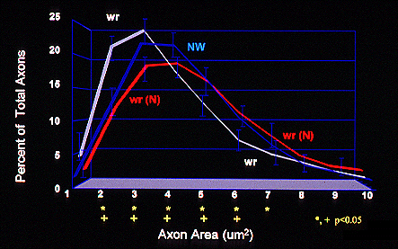 that treatment with N-acetyl cysteine results in an increase in the distribution of wr/wr axon calibers to NW levels. For all groups n=6; Values represent the mean + S.E.M., (*) signifies a significant difference (p<0.05) between wr/wr(N) and wr/wr groups at the indicated axon area. (+) signifies a significant difference between NW and wr/wr groups at the indicated axon area. Within a given group, individual percent values did not vary by more than + 2% of the mean.