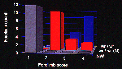 were scored seperately for each animal. For the NW and NW(N) -(not shown) groups, n=6, with all animals scoring "1". For wr/wr, wr/wr(N) groups, n=8 animals per group. For each
